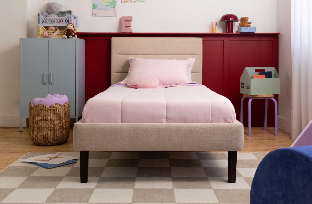 A soft upholstered frame and channel headboard create a cozy, modern feel. Neutral colours make it easy to style over the years, while the elevated design gives kids extra pride in their room.